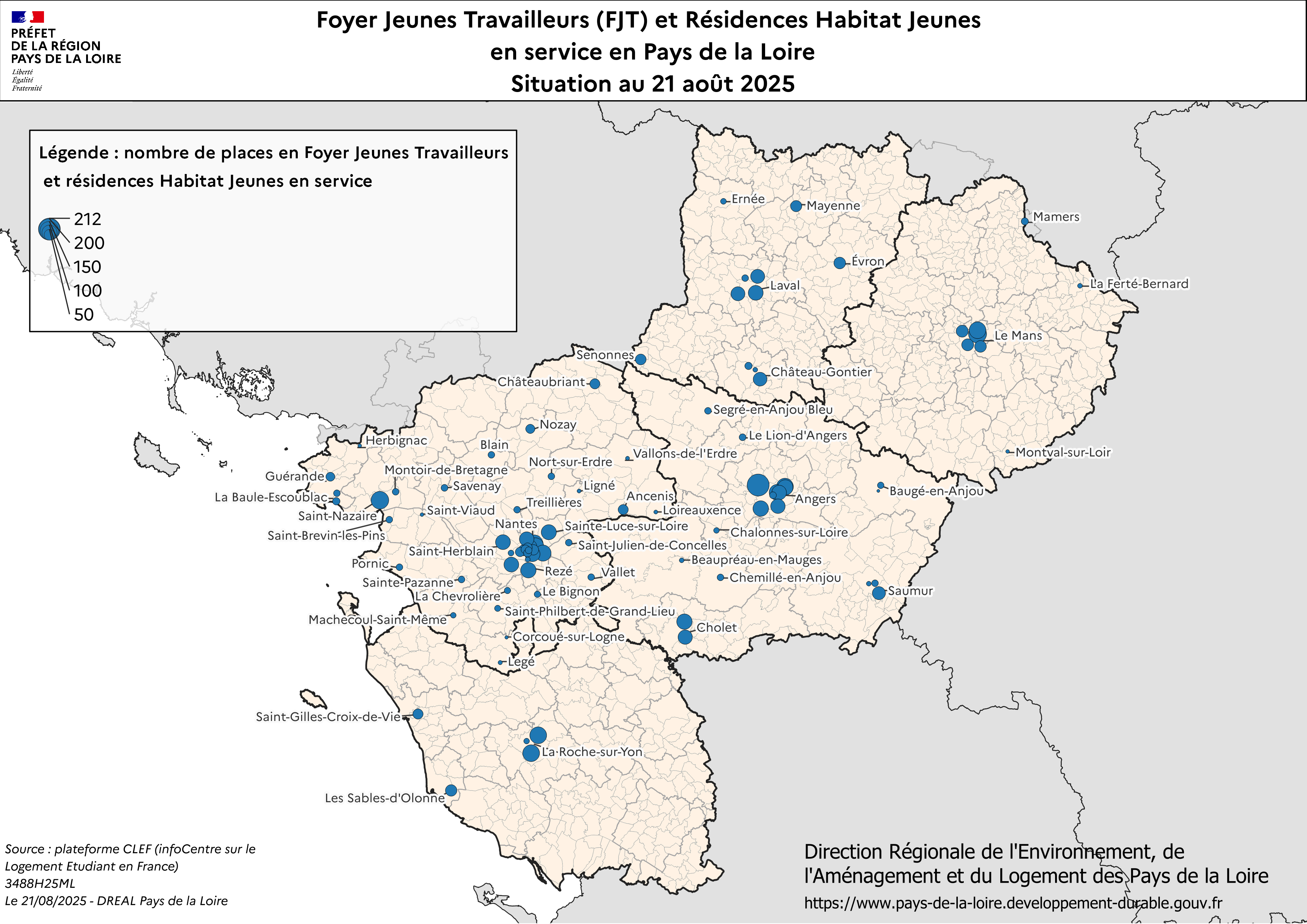 91 foyers de jeunes travailleurs (FJT) et résidences habitat jeunes sont en service en Pays de la Loire, à fin août 2025, pour un total de 4 741 places.