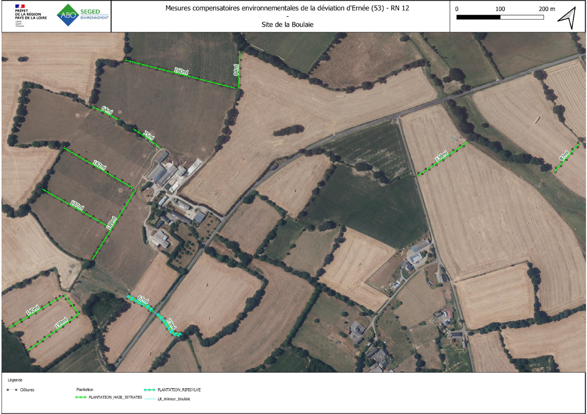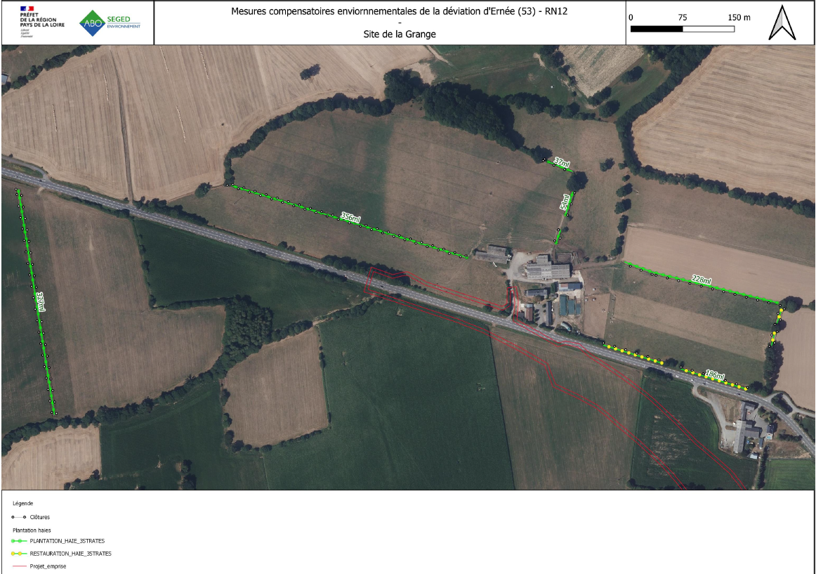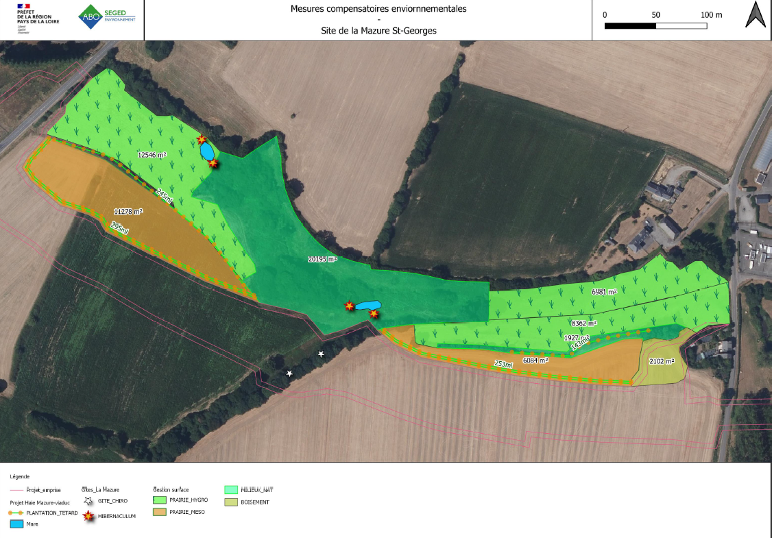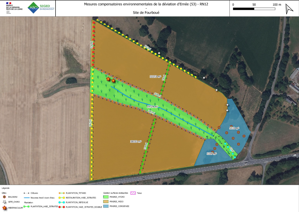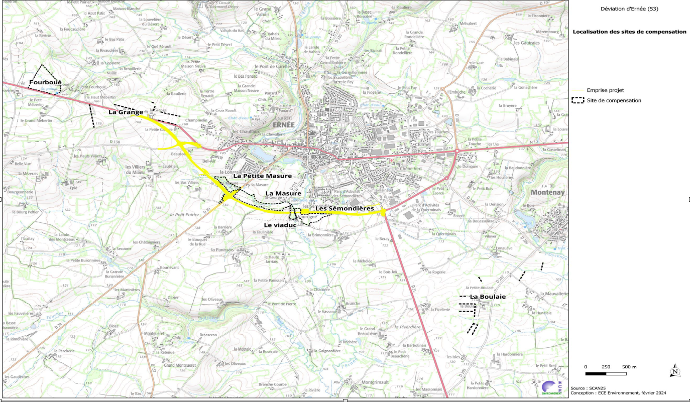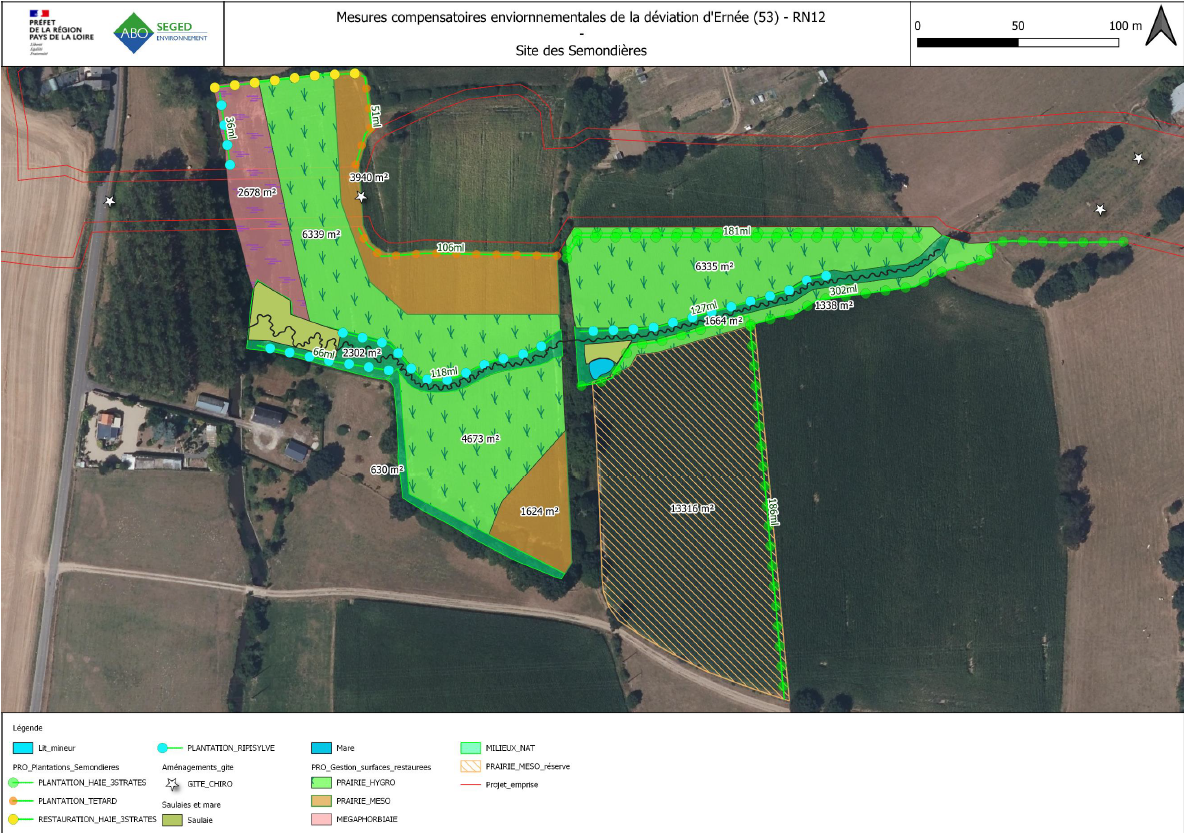 • Autre site majeur de compensation environnementale sur ce projet, c’est le site des Sémondières, en contre-bas du futur viaduc de l’Ernée. À cet endroit, le cours d’eau, actuellement busé, va être débusé et reconfiguré afin de retrouver un écoulement naturel avec des méandres. Un dalot permettra de franchir le cours d’eau ainsi restauré. De nombreuses plantations de haies et de boisements avec des essences locales et adaptées au climat de la région seront plantés. Une mare sera également créée. Tous ces aménagements permettront de favoriser la biodiversité.