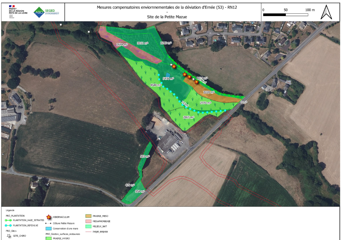 • Sur le site de La Petite Mazure (le long de la route départementale RD 29), la maison actuellement présente sur le site va être démolie. Le plan d’eau aujourd’hui présent va être supprimé et une mare sera conservée afin d’améliorer le développement de la biodiversité sur le site. En parallèle, le site va être entièrement renaturé. Plusieurs abris pour chiroptères vont être installés ainsi que des hibernaculums permettant le développement de la petite faune : petits mammifères comme les hérissons, grenouilles, crapauds ou encore insectes. Les hibernaculums fournissent des nombreux services à ces espèces : abris, nourriture, lieu d’hivernage.